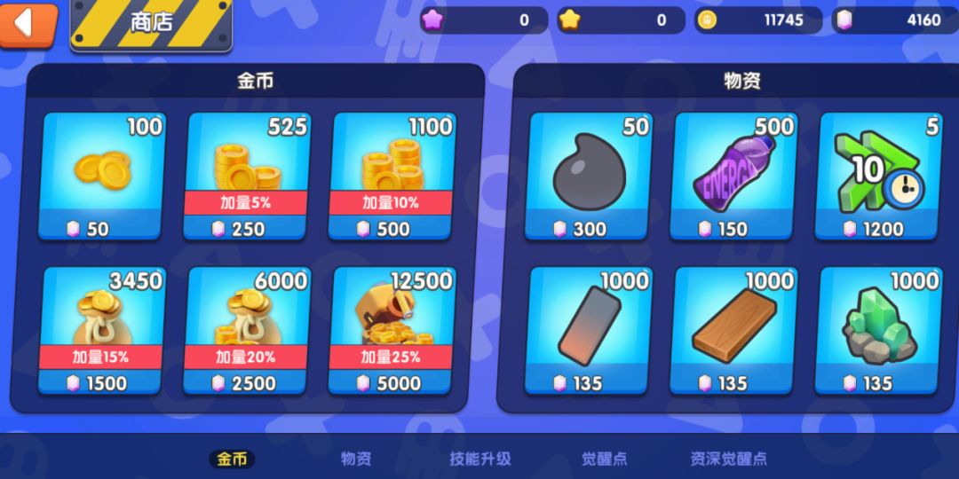 【商店】:在商店则可以购买【金币】【物资】【技能升级】和【觉醒点】