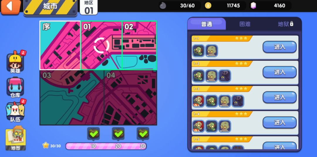 如果所有的关卡都已经挑战完毕,就可以点击左下角的【世界地图】来切换片区,前往更遥远的地方,获取资源和道具啦。清扫僵尸的任务,任重而道远呐~