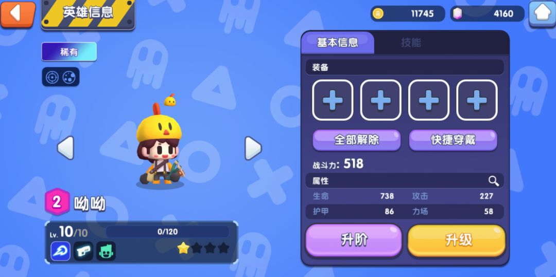 点击选定的小伙伴,进入【英雄信息界面】,就可以通过【升级】【升阶】【技能】【装备】等操作来强化他的战力啦~