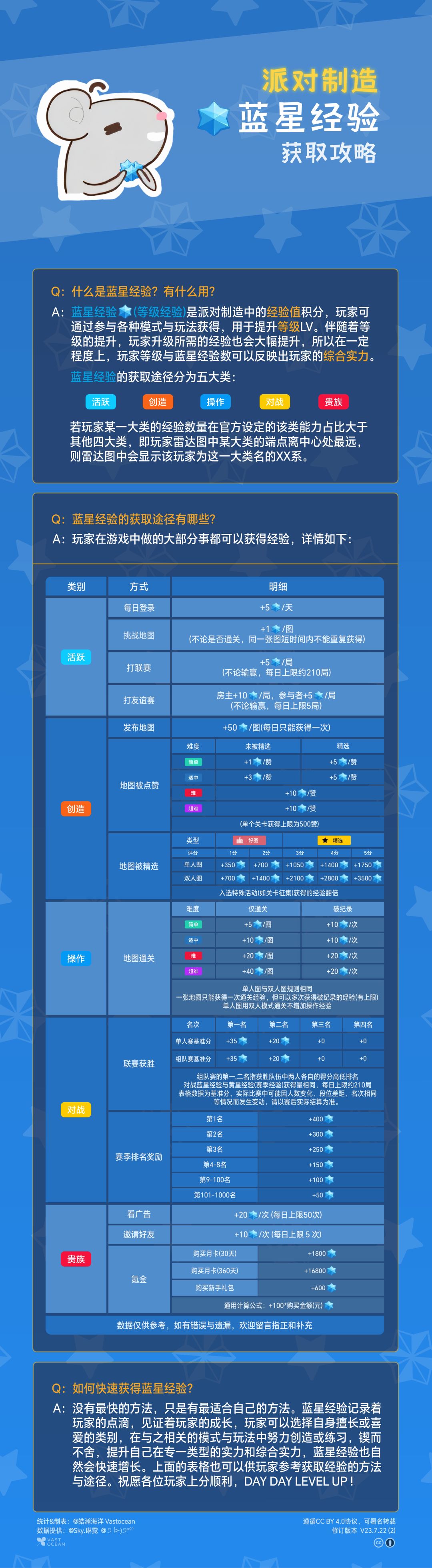 蓝星经验(等级经验)是派对制造中的经验值积分,玩家可通过参与游戏中各种模式与玩法获得,用于提升等级。换句话讲,玩家在游戏中做的大部分事都可以获得经验,可以说蓝星经验记录着玩家的点滴,见证着玩家的成长。