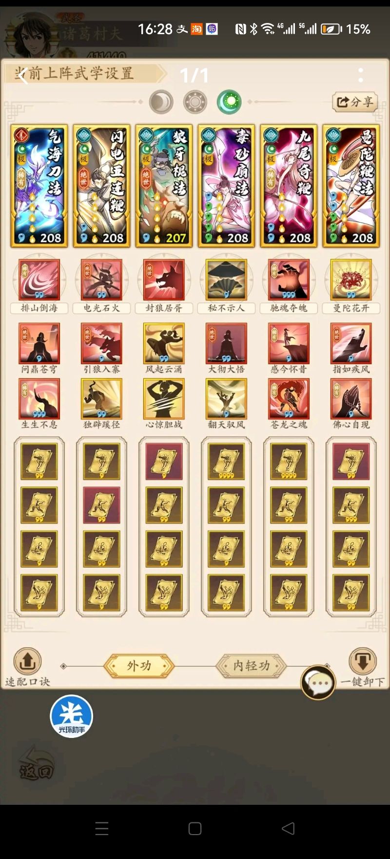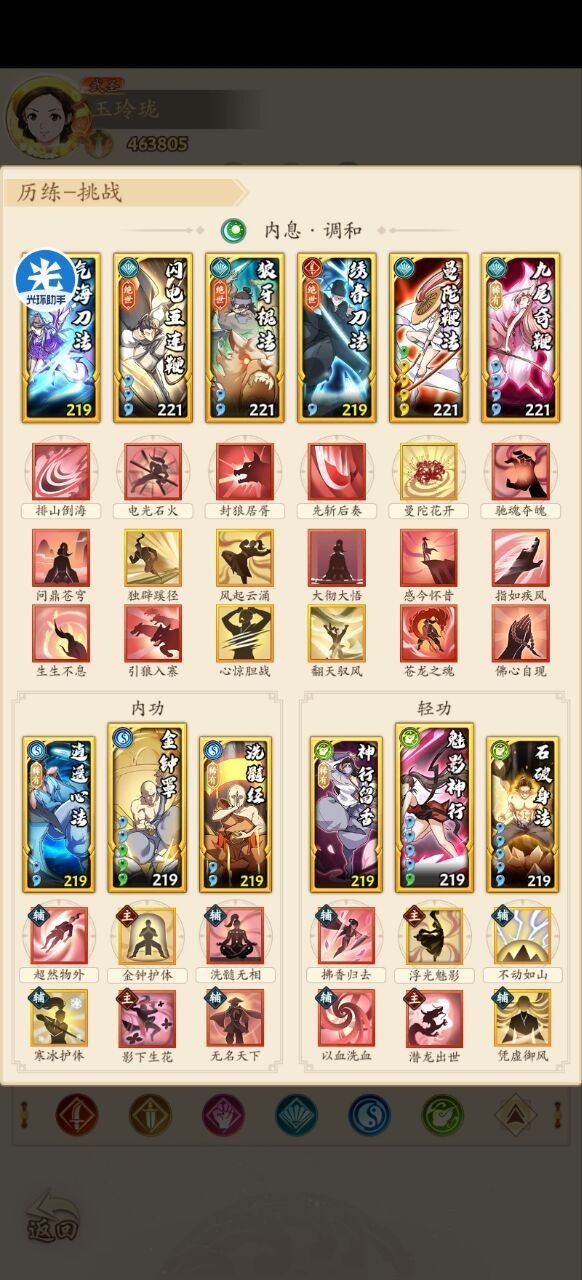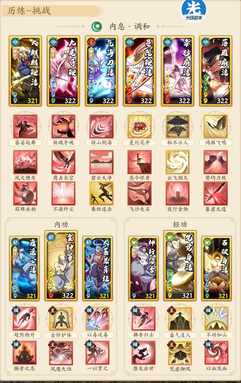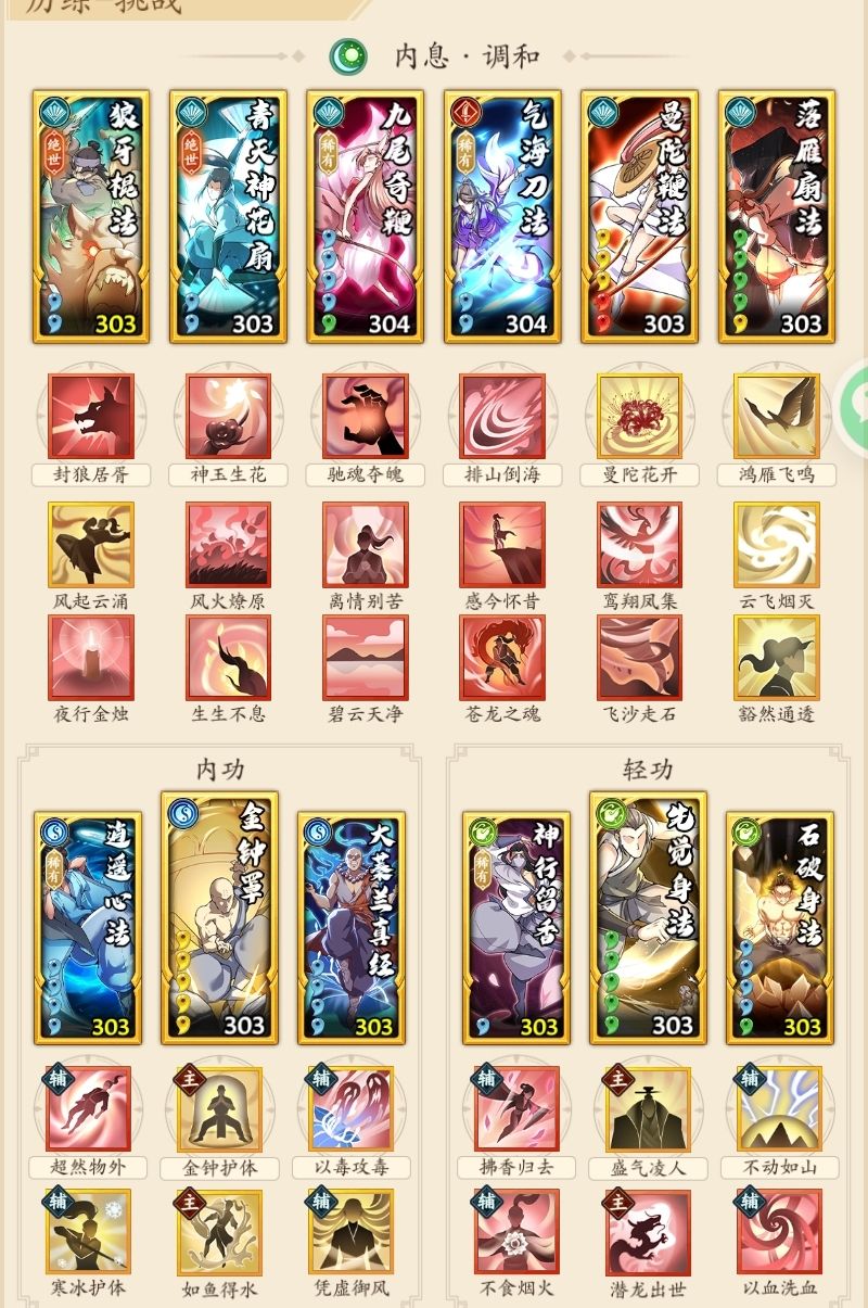3.内功轻功除风魔外都可自行调整,但是要注意聚气的节奏是否理想(确保风魔挡点穴,感今和飞沙要先于如来放出),同时尽量调整内轻的聚气,让气海吃到对面核心技能。