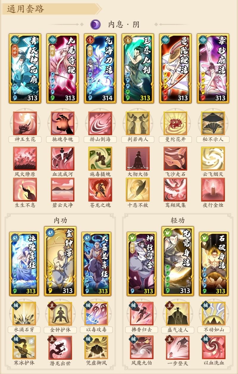 调和阴互切:外功1曼陀/2毒砂/3落雁,内功轻功1金钟/2先觉/3自行判断。