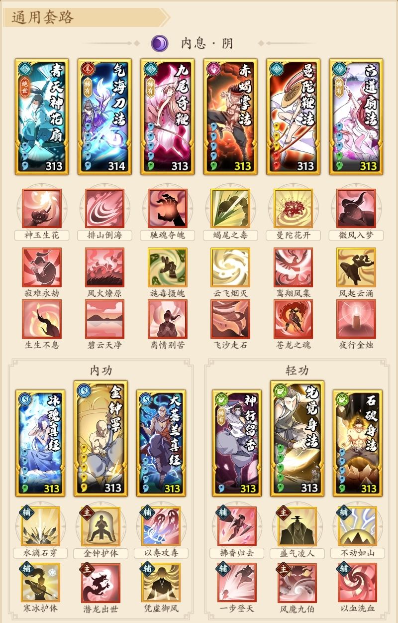六.内功轻功方面,如鱼寒冰凭虚潜龙这4个锁定,不食烟火和以血提供肉度,也可替换换骨增强收割能力,但是不建议上三步破坏匀速聚气的节奏。