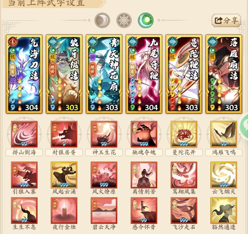 最后说一下如果想极致养成,前期心愿可以不开招式,或者只开特别有用的招式比如风起云涌,心惊,影下这种,尽量用武库的积分换出招式,或者等歪,因为前期每日心愿比较好出,提升核心武学等级可以为后面打基础。当然想舒服的玩就不用考虑这么多,想拿招式就拿,毕竟抽卡比较看脸。