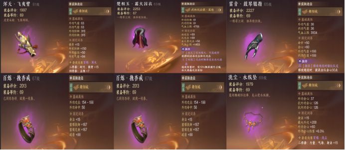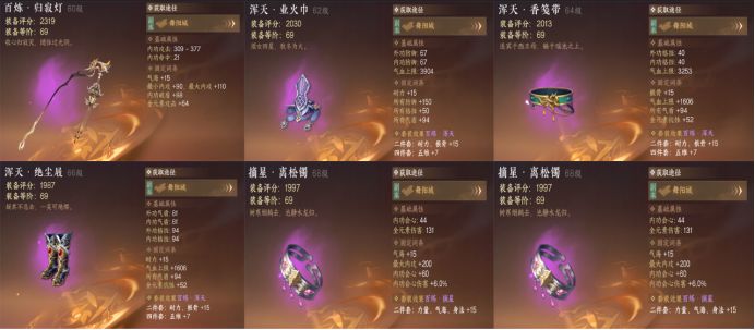 护腕【浑天-疏星袖】衣服【百炼-玄嚣衫】手套【雷音-鼓琴银指】戒指【百炼-独幽戒*2】项链【摘星-宵河坠】