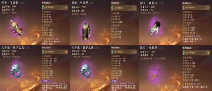 护腕【浑天-飞夷臂】衣服【百炼-中天铠】手套【浑天-断肠手】戒指【六尊使-驭下之戒*2】项链【洗尘项链】