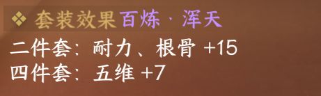 输出的话凑不齐【浑天4件套】可以选择【横戈4件套】五维+7的效果,因为头腰鞋护腕这些装备的属性都是气血防御相关,作为输出可以暂时不用这些词条,优先凑出4件套的效果。