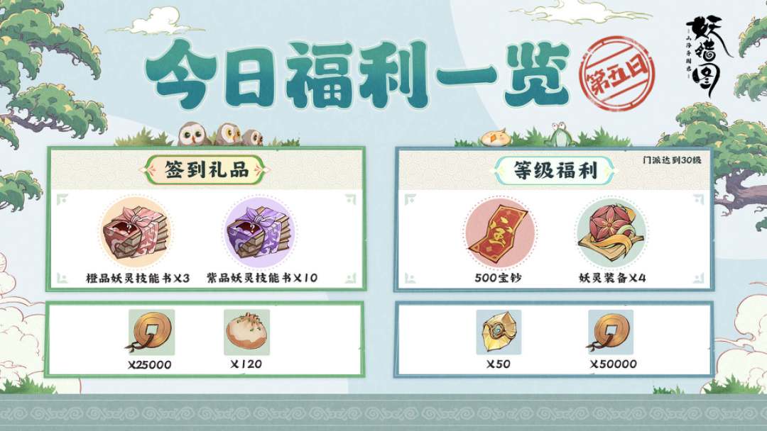 掌门!周末愉快~!今天是点校测试第五天,上线签到就能领取妖灵技能书!在等级达到30级后,还可以领取宝钞和妖灵装备,快快行动起来,做任务啦!