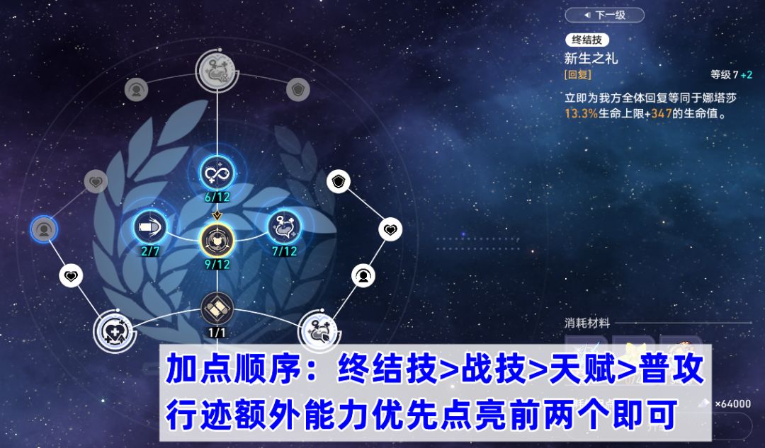 作为一名依靠生命值加成治疗量的治疗角色,娜塔莎的培养难度并不高。技能加点方面,推荐:终结技>战技>天赋>普攻,行迹方面优先点亮前两个额外能力即可,以及尽可能点亮生命值和效果抵抗加成。