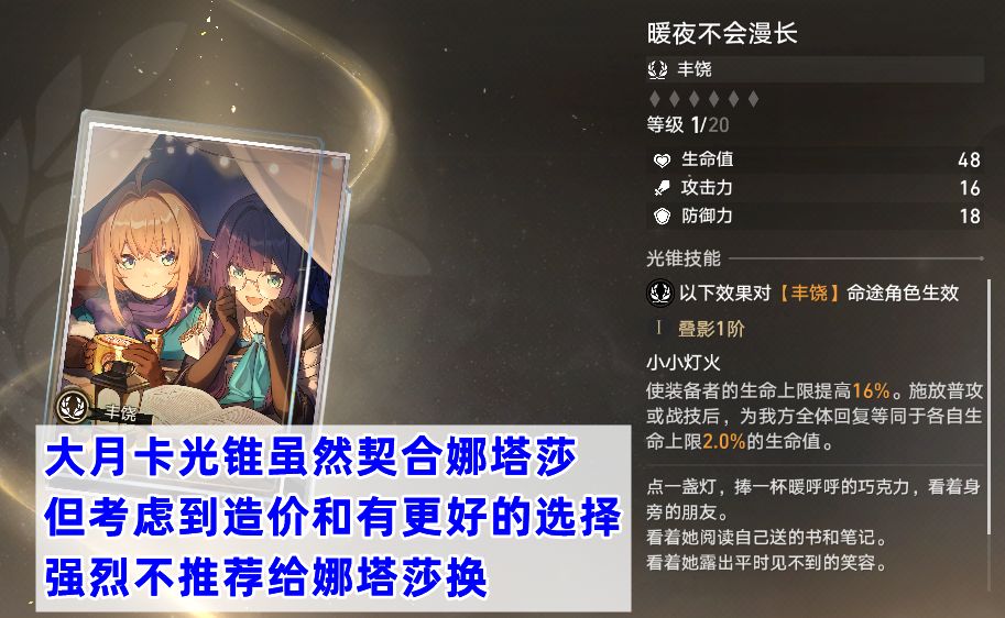 光锥方面,首选专属光锥一场术后对话,叠影越高越好,因为充能加成提升效果相当明显。次选时节不居;然后再是同一种心情、此时恰好和等价交换。大月卡光锥暖夜不会漫长虽然契合娜塔莎,但是考虑到造价,以及大月卡光锥有更优先兑换的选择,所以不推荐。