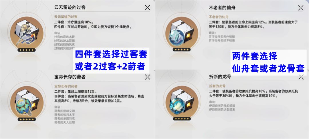 遗器四件套推荐过客套,或者2过客+2莳者散搭;两件套推荐仙舟套或者新出的折断的龙骨。主词条方面,在选择不多的情况下,可以全部选生命;当然最好还是优化下主词条:躯干首选治疗加成,脚部可替换速度;充能绳则没有太大必要。副词条优先找生命值、效果抵抗和速度。