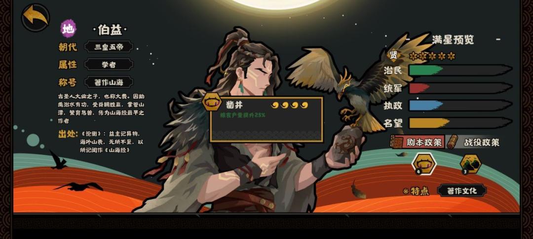 山泽鸟兽技能:要求在科技点低于5的情况下才可以触发,增加15%的军队规模,在不同季节触发不同的卡牌神兽,跟后稷打配合还是不错的,增加战力,军规以及粮食产量,这样的配合相对全面。但是对于单体而言,有这个名臣感觉跟没有也没啥区别。个人表示娱乐玩家可以体验一下,本人最喜欢腾蛇卡牌,风筝别人是真的爽。