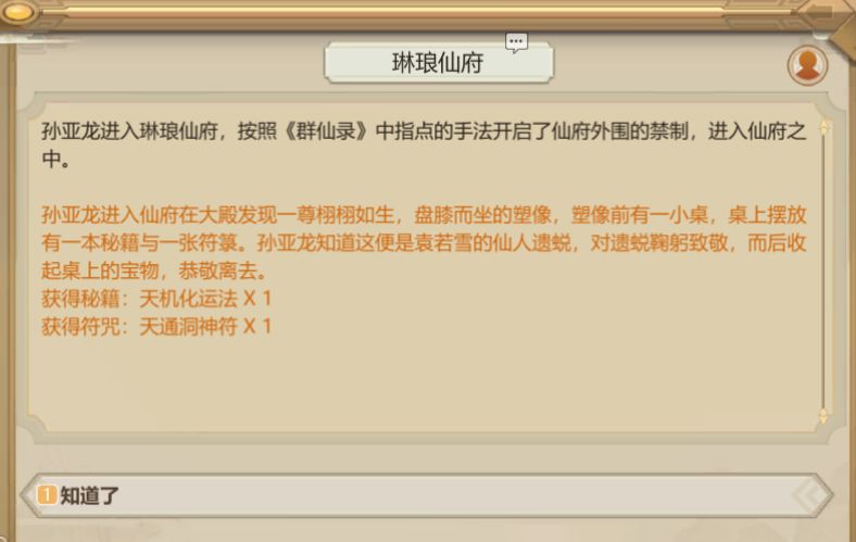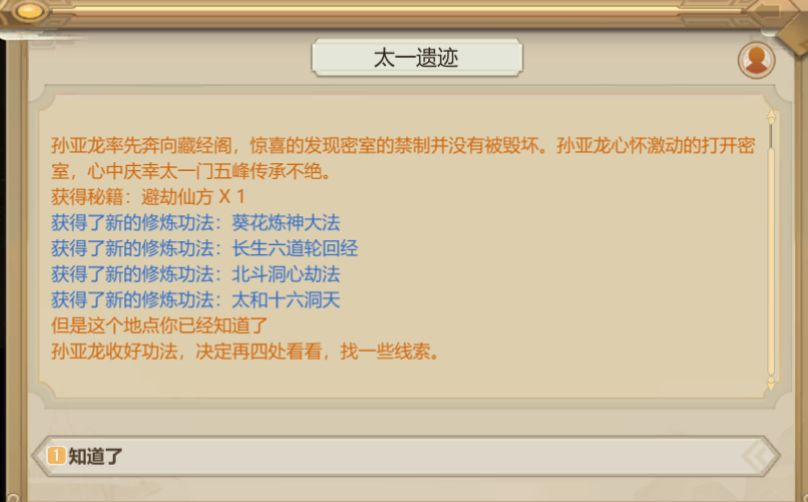 触发事件“重回太一”后,派一个内门去月轮山历练,同样不需要进图。历练结束带回一堆功法。