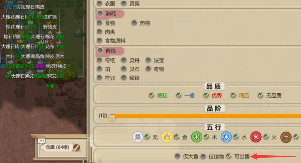 21日会来天下行商。有一种赚钱的方法是刷灵石枪或者灵石弓。但是对于入门新人来说,是来不及准备那么多灵石武器的。这个时候我们可以卖一些大理石砖,肉类,肉干。先给仓库开启可出售。