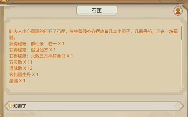 石匣带回门派后,打开,获得一堆重要物品