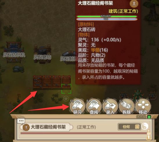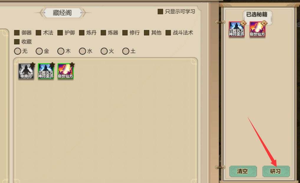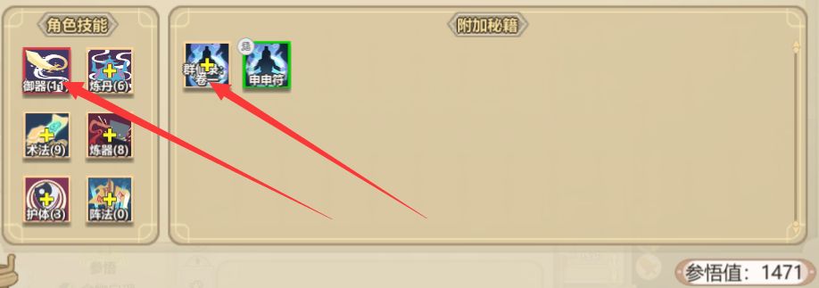 石匣中的三本书,《群仙录》装备上,其他两本需要录入。留一个内门在家调心。心境越高,录入获得的参悟值越高。调至80以上就可以开始录入功法。录入功法获得的参悟点御器。装备群仙录,在下图栏里使用,会解锁地点玄空洞、琼楼。