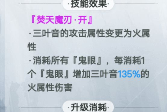 三叶音作为主战角色时候才会生效的技能,每次暴击获得一颗鬼眼,十级技能6颗鬼眼可以获得300%火属性伤害加成。注意这是不开大期间的火属性伤害加成,且只有你穿戴的武器为火属性时,才能享受火属性伤害加成!例如:你穿带水属性武器,那么你只能享受你面板的水属性伤害加成。