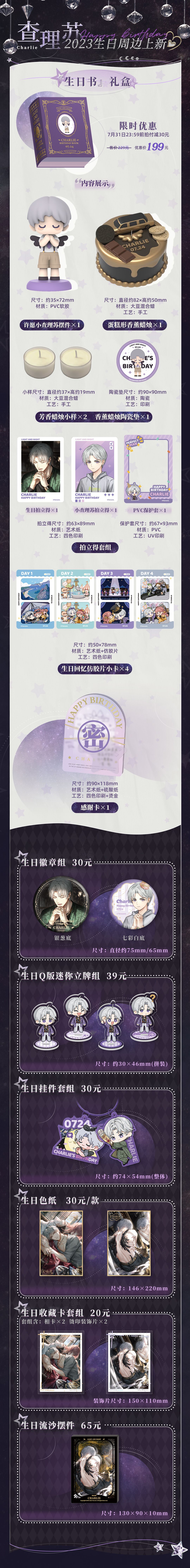 ◆ 生日Q版迷你立牌组、生日Q版挂件套组、生日流沙摆件、生日徽章组、生日色纸、生日收藏卡组六款新品限时预售上线,查理苏2023生日周边新品限时预售时间:7月24日中午12:00-8月8日 23:59