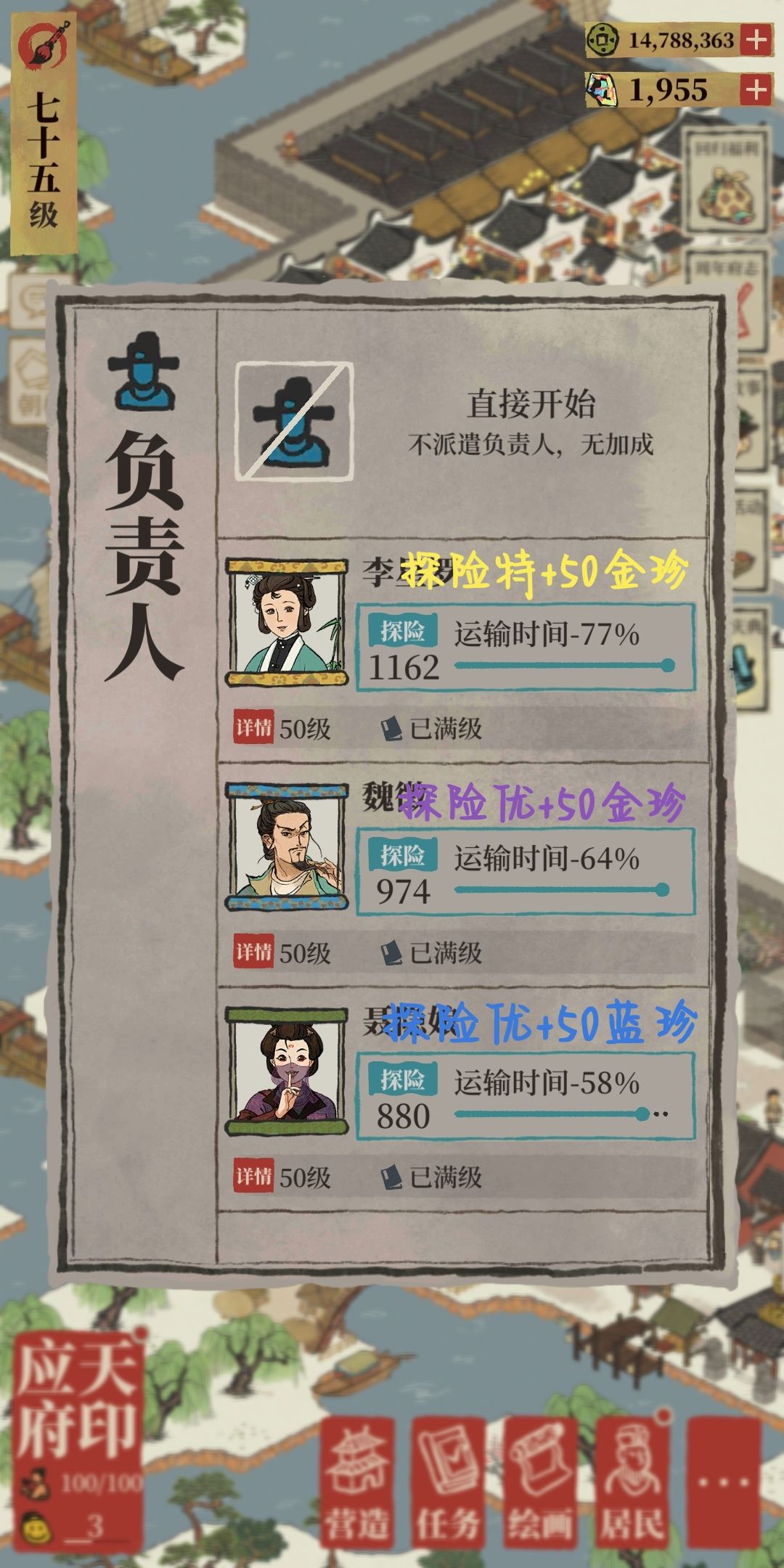 也有例外,白玉堂和王如一都是理财探险双优,会放在绍兴。理财用于商行上货,探险用来做原产地发货。但是,绍兴的特产产量很低,所以,它们基本在遛弯。