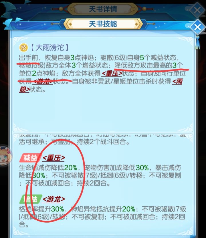 3,加减伤效果(非核心效果)。主动技能的《重压》减益+《游龙》增益,是每回合触发,目前数值还可以,以后相对较弱。
