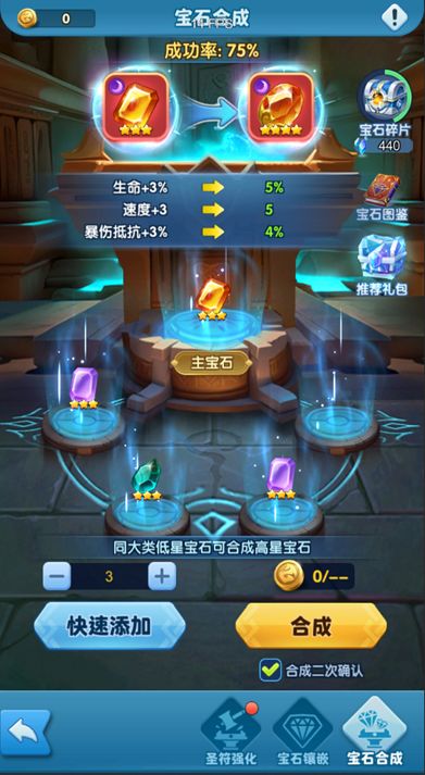 4.宝石合成有几率失败,合成失败时会获得一定的宝石碎片,消耗一定碎片可以兑换3星随机宝石宝箱;