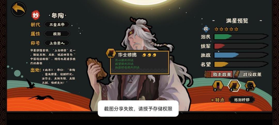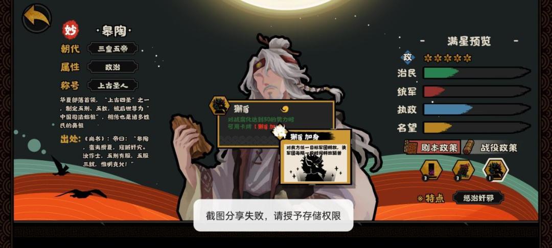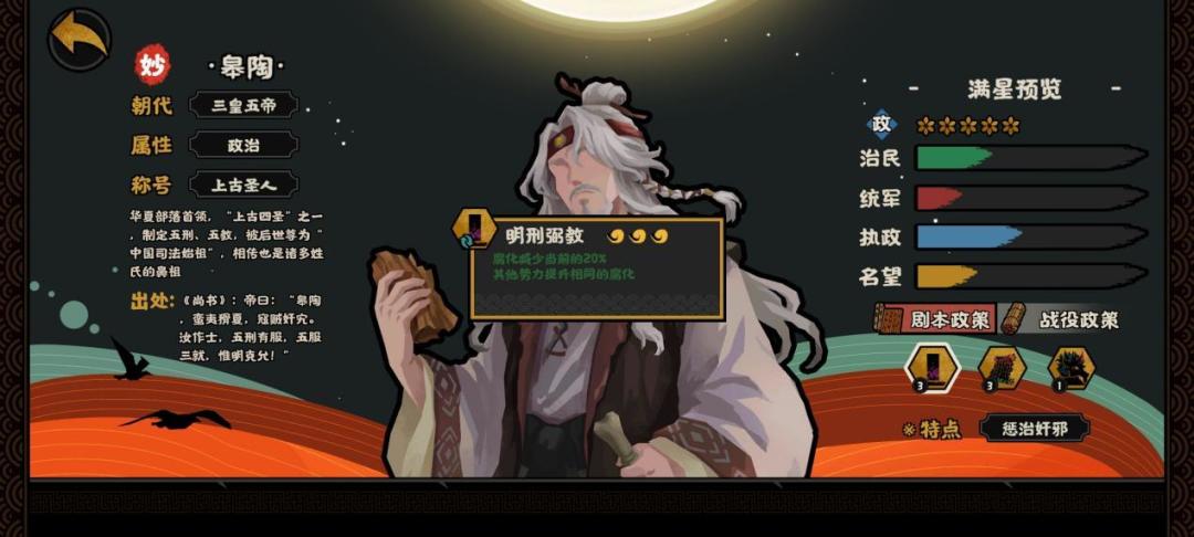 当然,这只是对单个技能进行论述,总体而言,身为政治位置,皋陶的技能不如很多政治位的名臣。但是如果换一个定位身份贤者的话,皋陶就可以跟霍去病、张汤、西施,打出一个非常快乐的操作;如果换成民生身份,皋陶就可以跟霍去病、张汤、东方朔也可以形成不错的配合。可是各它设计的名臣并没有如果,只能说一句可惜这个名臣了。