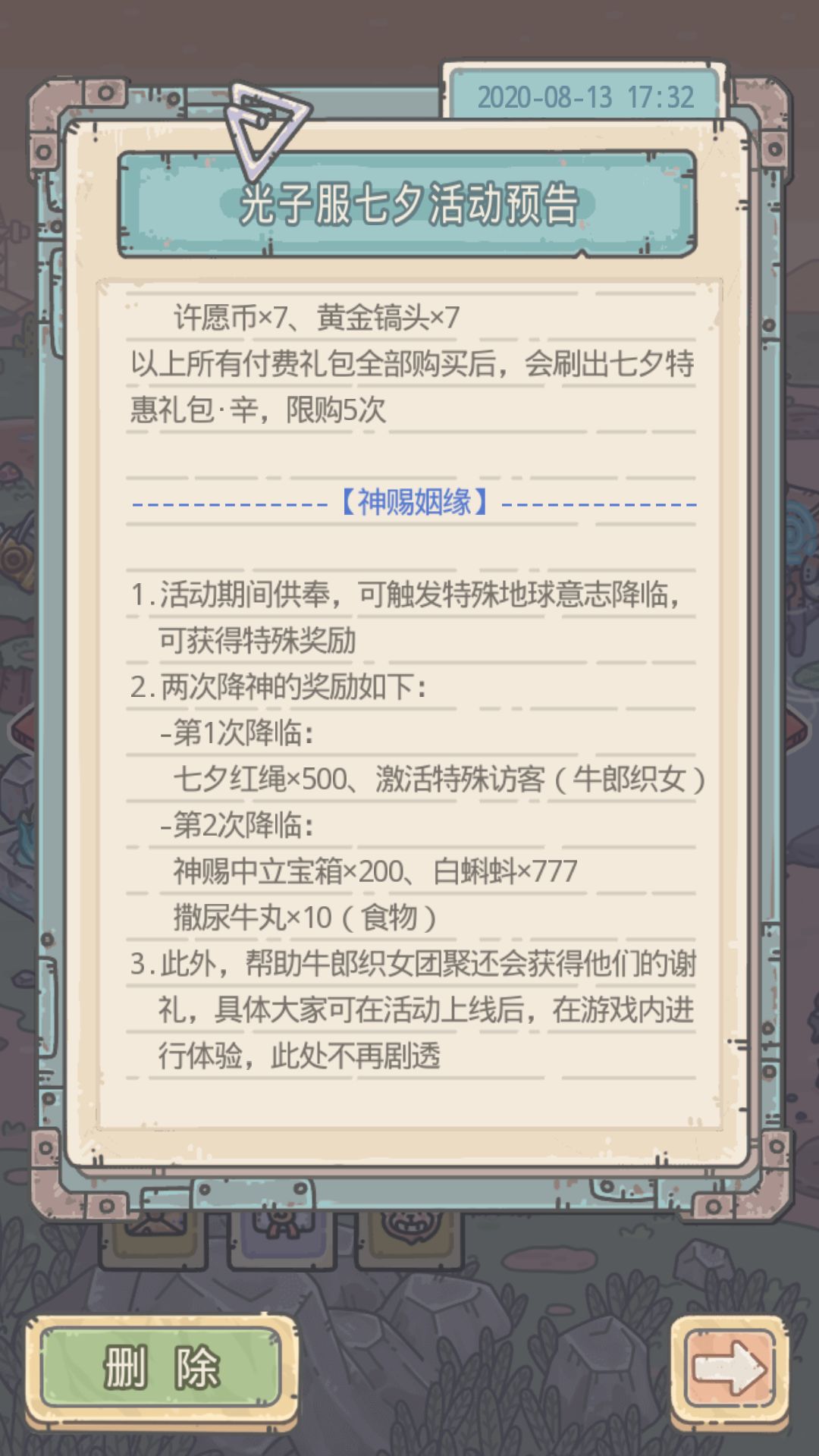 牛郎2次来信后给他777黑蝌蚪等10分钟然后牛郎织女都会来,然后给你这些(不用战斗)