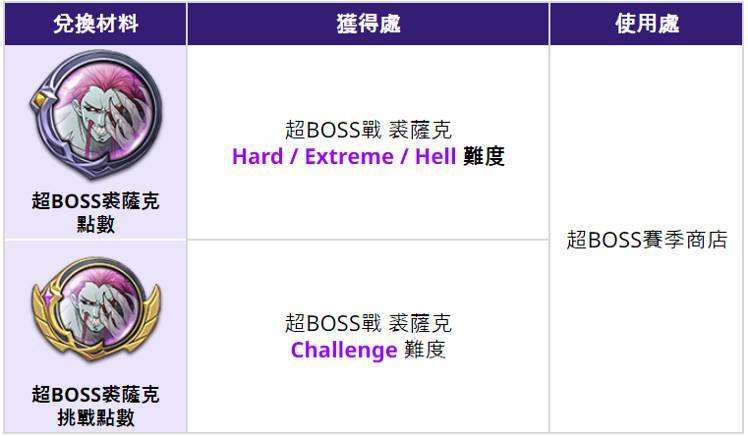 - 使用依照難度可獲得的2種點數,可以在[超BOSS戰賽季商店]兌換各種獎勵。