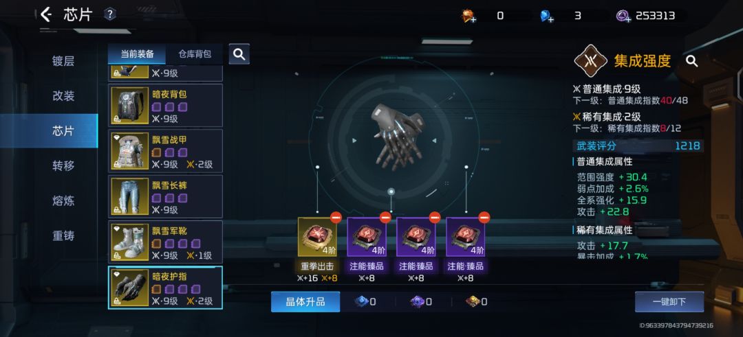 2,芯片 (希望可以调整一下芯片的数值)芯片分为蓝,紫,金三种芯片(一定要注意芯片也是有套装等级的)目前数值的提升还是很可观的 一个芯片占一个卡槽。一阶芯片升到2阶需要两个芯片,二升三需要3个芯片,三升四需要五个芯片,四升五要8个,五升六要13,六升七要21。记住总共有22个芯片卡槽哦