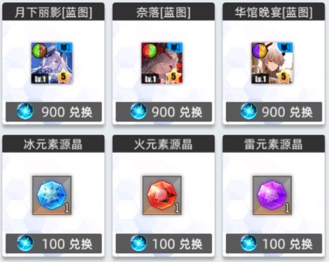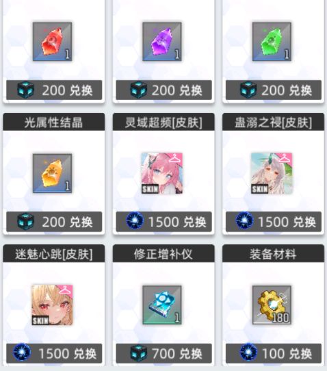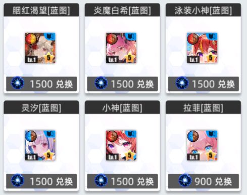兑换所内可兑换五星锻造卡蓝图和一些资源还有三个皮肤。推荐蓝图优先兑换和平使者 米菈、离心小行星 七七、沁凉夏风 拉菲、游戏少女 小神、学院泳装 小神、黯瞳 诺伦、湛空之忆 菲琳(看需求兑换,玩睡队优先换米菈,不玩优先换七七)。资源按需求进行兑换即可。