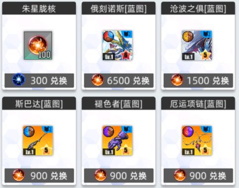 兑换所内可兑换六星、五星锻造卡蓝图和一些资源。推荐蓝图优先兑换俄克诺斯、沧波之俱、斯巴达。资源按需求进行兑换即可。