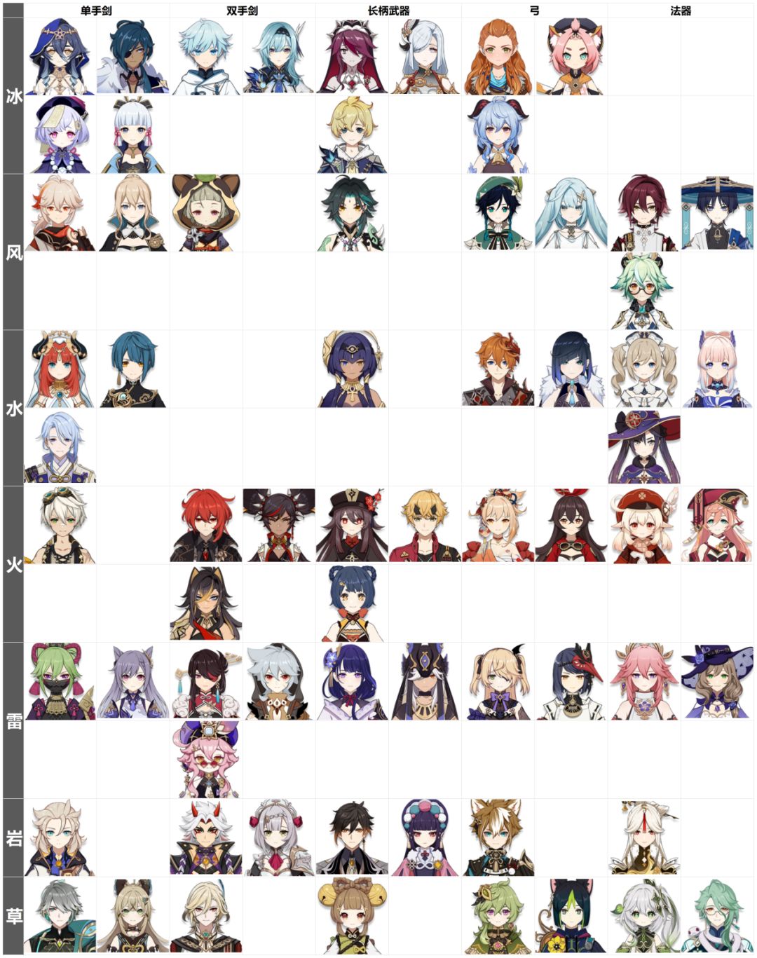 正是这五种武器类型和七种反应元素为我们构建了完整的游戏体系,就像排列组合一样,每种武器类型都能与一种相应的元素结合,因此出现了许多令人爱不释手的角色。本期笔者将为大家带来七元素和五大武器之间的“排列组合”,快来看看角色们的类型分布吧!