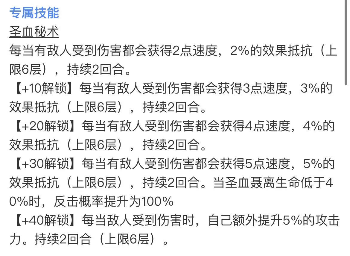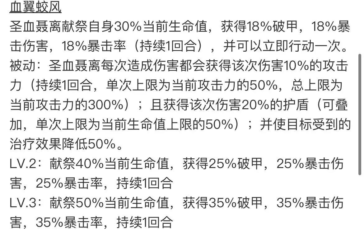 属性:对于圣血聂离来说主堆属性肯定是暴击,攻击,爆伤,还有破甲。从技能上看血量降低可以提升攻击,在攻击这方面的优势明月可以稍微少堆,可以优先提升暴击以及破甲等属性。