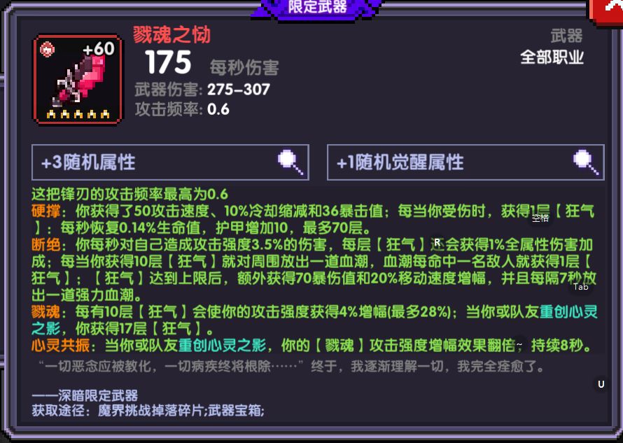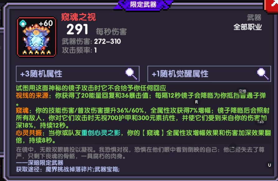 必须要带不然触发不了心灵共振)提供50攻击速度,10冷却和36点暴击值 满层狂气给自己提供28%攻强增幅(触发心灵之影会提供额外28%攻强增幅),70爆伤,70全属性伤害加成,20移速,这加成密密麻麻目前单人还没有带的因此洗练属性可以为爆伤,首领伤害,攻击强度,觉醒属性为爆伤