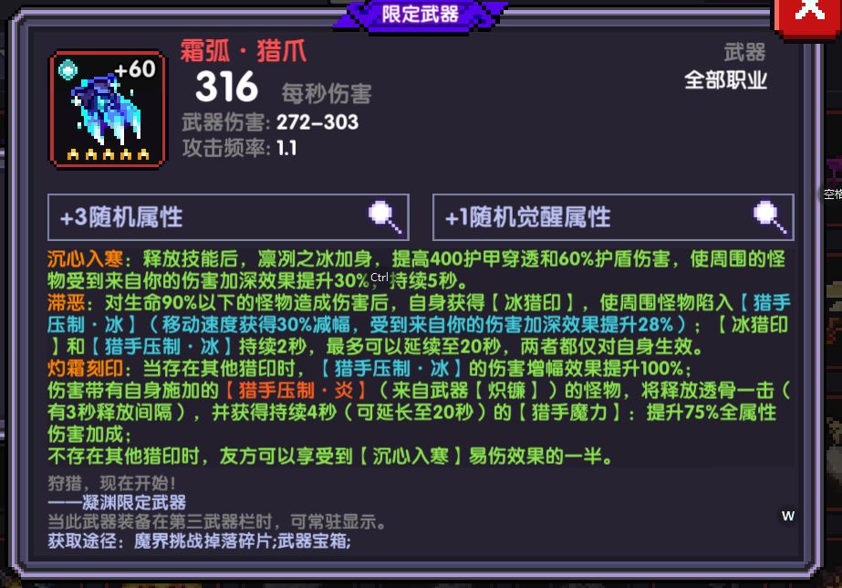 洗练属性是暴击,爆伤,护穿,觉醒属性:护甲穿透/爆伤提供很多优质的属性400点护甲穿透和60护盾伤害还有伤害加深(易伤)这个伤害加深队友是可以吃到的,因此还可以用来辅助队友,属于性价比最高的武器了