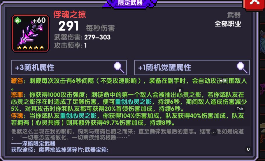 (对无小怪boss房特别好用),单人配合窥魂之视(镜子)一起使用,单人boss深谙水木搭配 组队的时候可以让队友带 也可以触发后面讲戮魂之恸(火刀),后面会说, 对单非常好用 ,提供104的高额全伤 1000攻强