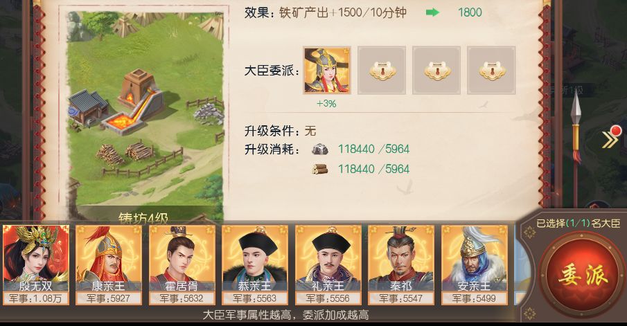 委派大臣能够使对应建筑的加成提高,提高量取决于大臣的对应属性(有的建筑要求军事,有的要求农业等等)。