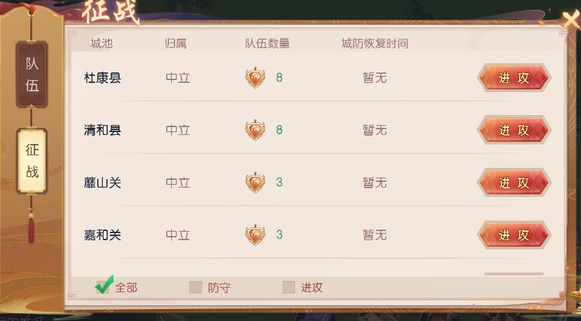 大本营之外的其他5个等级的城池都有一定数量的城防军守护,都是可攻占的,越高级的城池守军会越多,攻城难度越大。