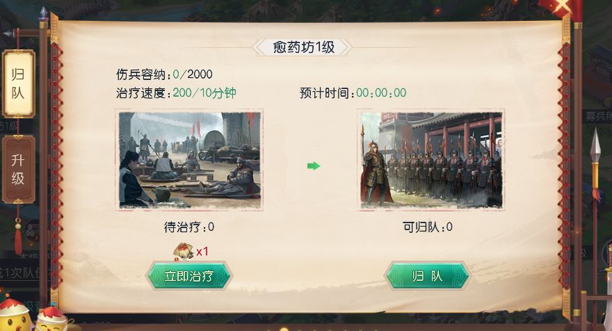 3、经过战斗后,在愈药坊治疗伤兵后“归队”。