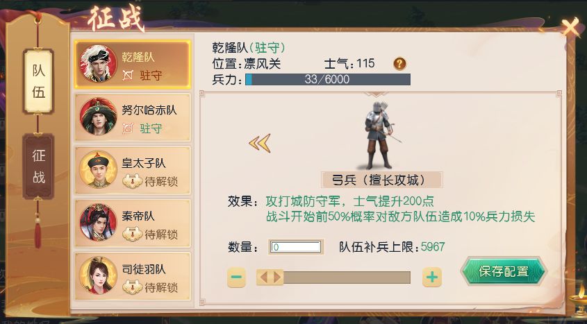 当圣上有了足够的预备兵之后,可以通过“征战”按钮进入“征战准备界面”,在其中派兵给大臣。