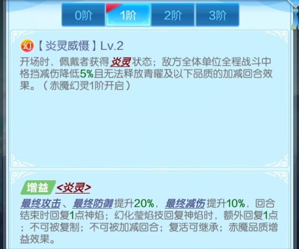 炎灵有30%最终攻击/最终防御,20%最终减伤,无回合限制(不继承给幻仙)。