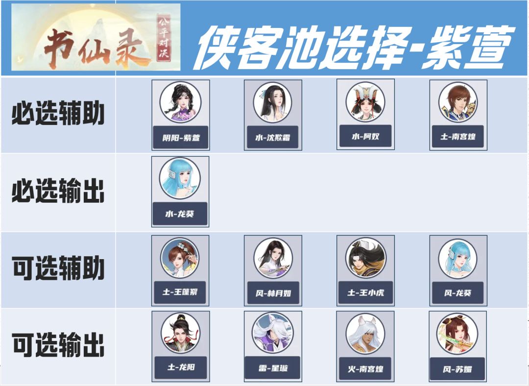 以水龙葵队的组建为思路,本次侠客池选择如下: