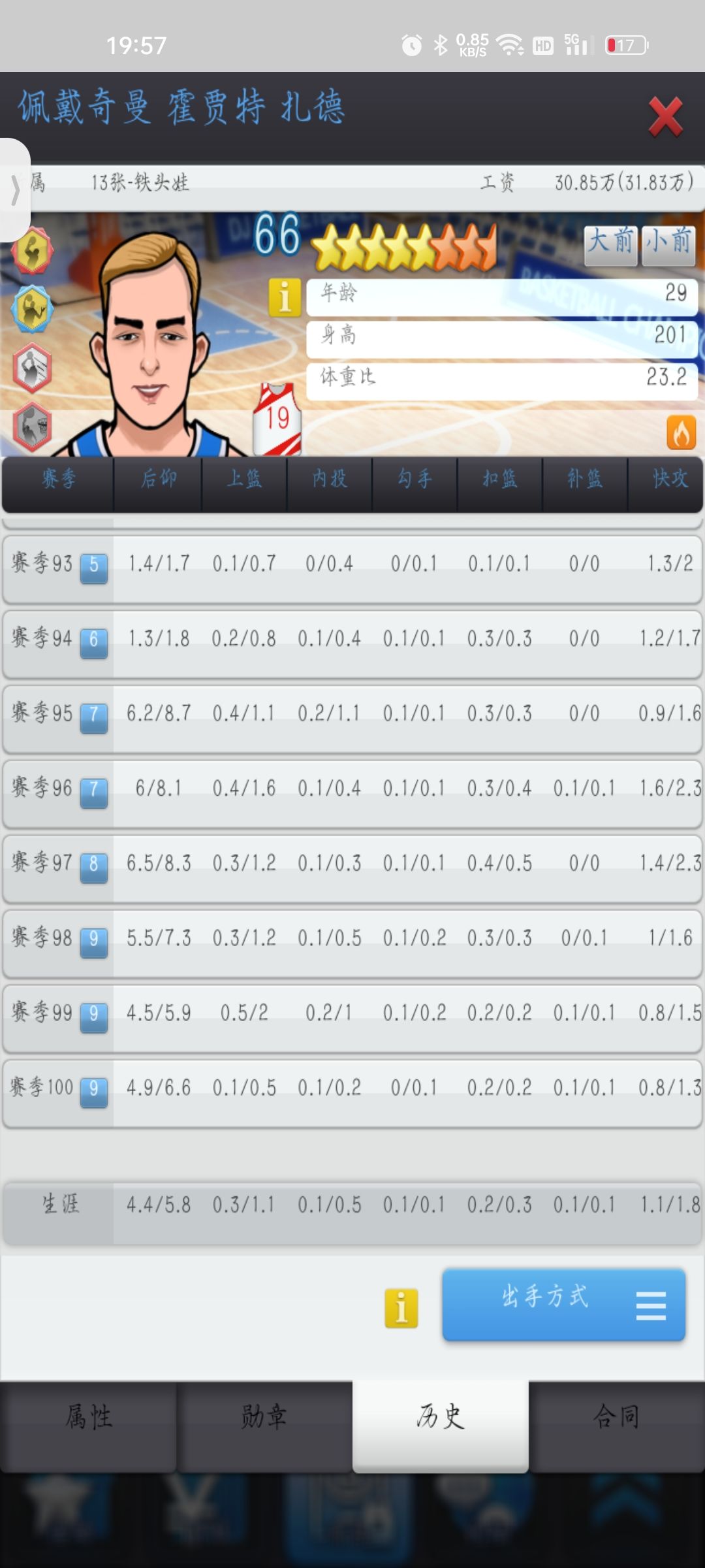 蹉跎5个赛季,终于上10联,分享一下我的建队思路,欢乐的中投小队,基本放弃3分,主打的就是一个接球就是一个后仰跳投,或者传来传去然后一个后仰,因为后仰命中是真的高,下赛季准备把俩中锋也换成中投类型,除非对面是满队3防,否则根本防不住。下面说说缺点,队伍成型较慢,我是除了控卫位置,其他都是3防,或者小3防,然后都带中投,我自己买了点半苗练了一些,上赛季队伍内防,篮板没练好,很容易漏板,因为要保证出手,所以每个人都还得要练控球,所以练好都25岁了,最后一点,尽量还要速度高点,入坑需谨慎。