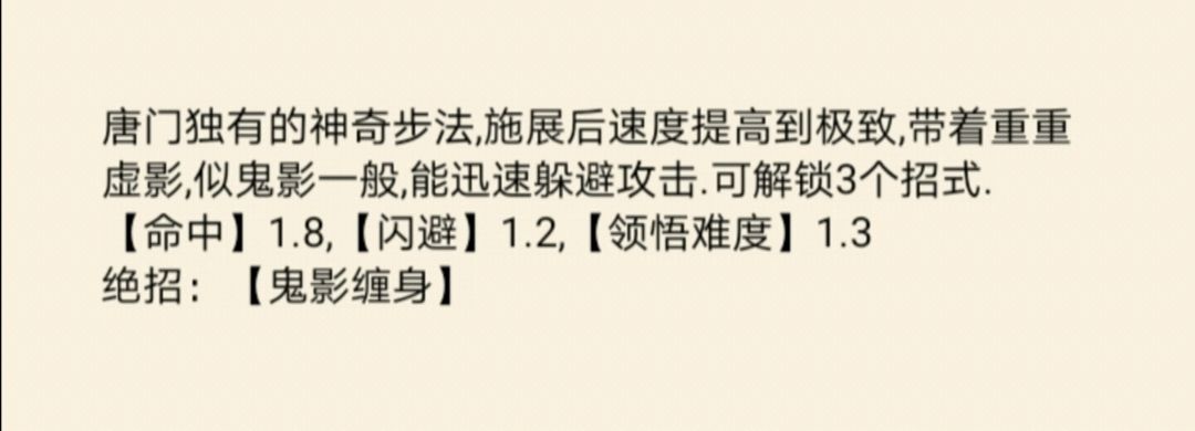 简介:唐门独有的神奇步法,施展后速度提高到极致,待着重重虚影,似鬼影一般,能迅速躲避攻击。可解锁3个招式。