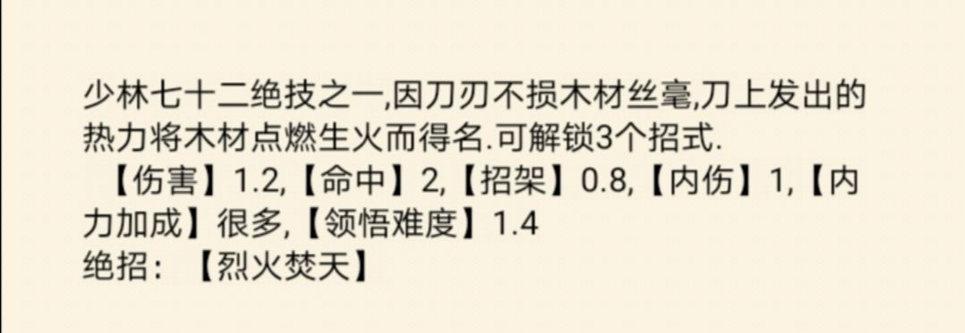 简介:少林七十二绝技之一,因刀刃不损木材丝毫,刀上发出的热力将木材点燃生火而的名。可解锁3个招式。