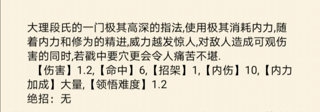 简介:大理段氏的一门极其高深的指法,使用极其消耗内力,随着内力和修为的精进,威力越发惊人,对敌人造成可观伤害的同时,若戳中要穴更会令人痛苦不堪。