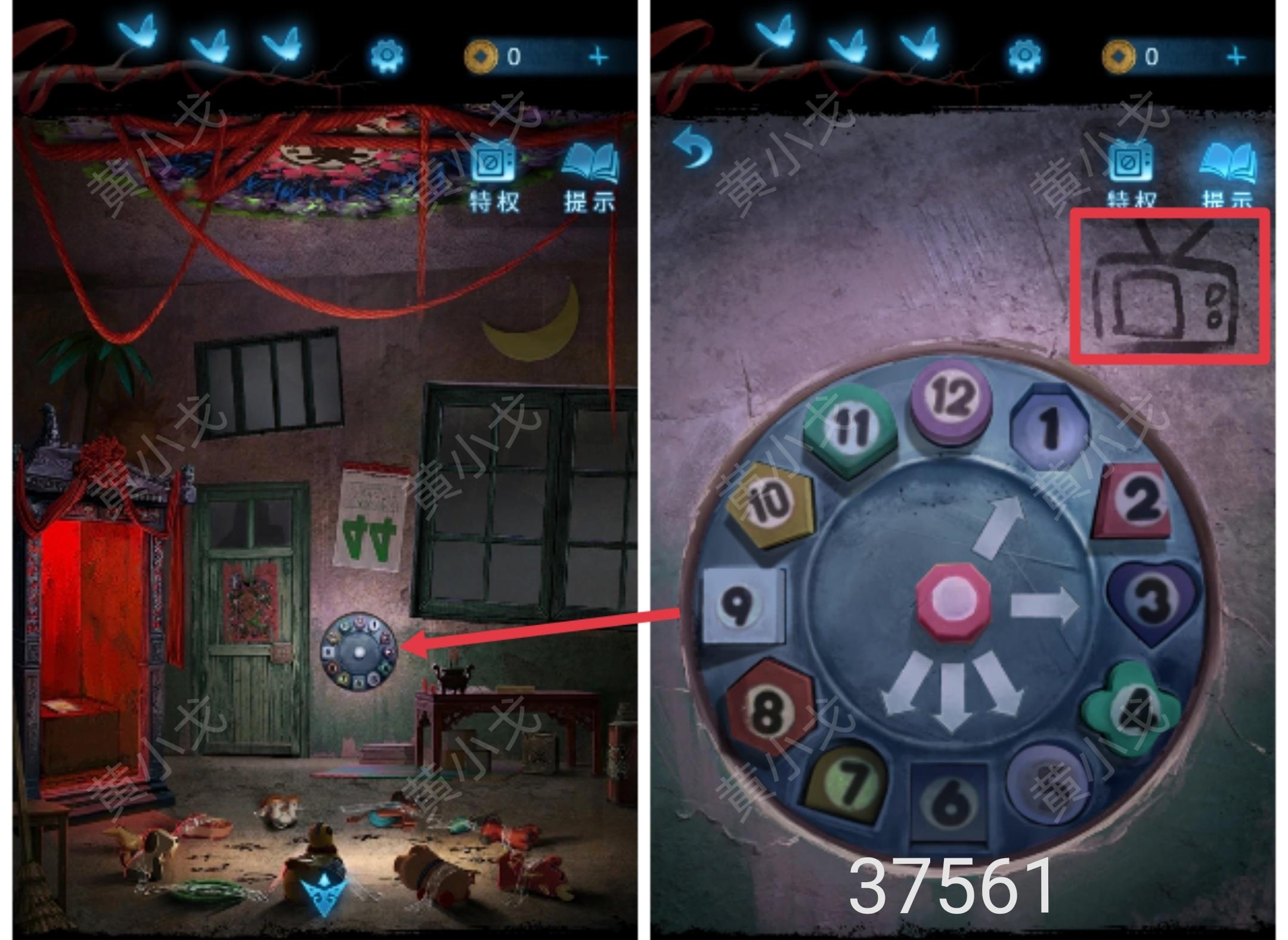 12.(树洞-老屋)点击墙上的机关,根据上面的电视图案,结合教室电视的线索,按(37561)的顺序按下数字按钮