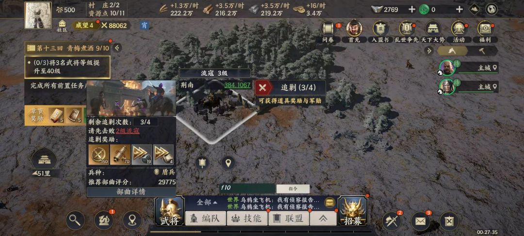 亲爱的主公,这期我们来介绍《战地无疆》的另一个在大地图上常见的NPC——流寇。主公可在大地图中寻找流寇进行追剿,或在左下角搜索对应想追剿流寇的等级。追剿次数”每6小时恢复一次,追剿次数的存储上限为4次,而流寇每隔4小时会在大地图刷新,主公需要合理规划时间,让自己流寇的追剿次数回复一直处于恢复状态。