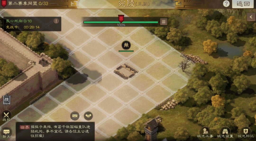 不过这里还有一个地图的改动,那就是格子虽然增多是以前的三倍,但是我们却不需要像之前那样把所有的格子都占领。并且额外新增了驻守功能,这会造成这样一种状况,那就是新的城内地图完全和一赛季时不同了,我们的行军路线不再是单一的,这会给我们玩家的攻防增添很多战术,也从一定意义上避免了我们之前诟病的一赛季浪费时间占格子,守城优势过大这种情况。并且驻守是让部队驻守再己方或友方格子上,只要敌人靠近到相邻的格子就会发起战斗,除了避免有人家跑你脸上等CD,你还傻傻站着不打浪费一回合攻击的情况外,我们还可以避免一赛季出现的,对方绕开某个有高战玩家的主城不打,先清理较弱的,最后集火钉子户的情况,现在做的就更加人性化,高战玩家的驻守不再局限于城门,更可以直接通过驻守贡献出自己最大的力量。