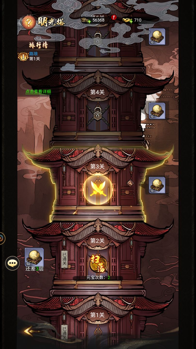玩法二、闯关爬塔进入途径:点击【冒险】界面的【明光塔】,即可选择不同的塔楼进行攻略